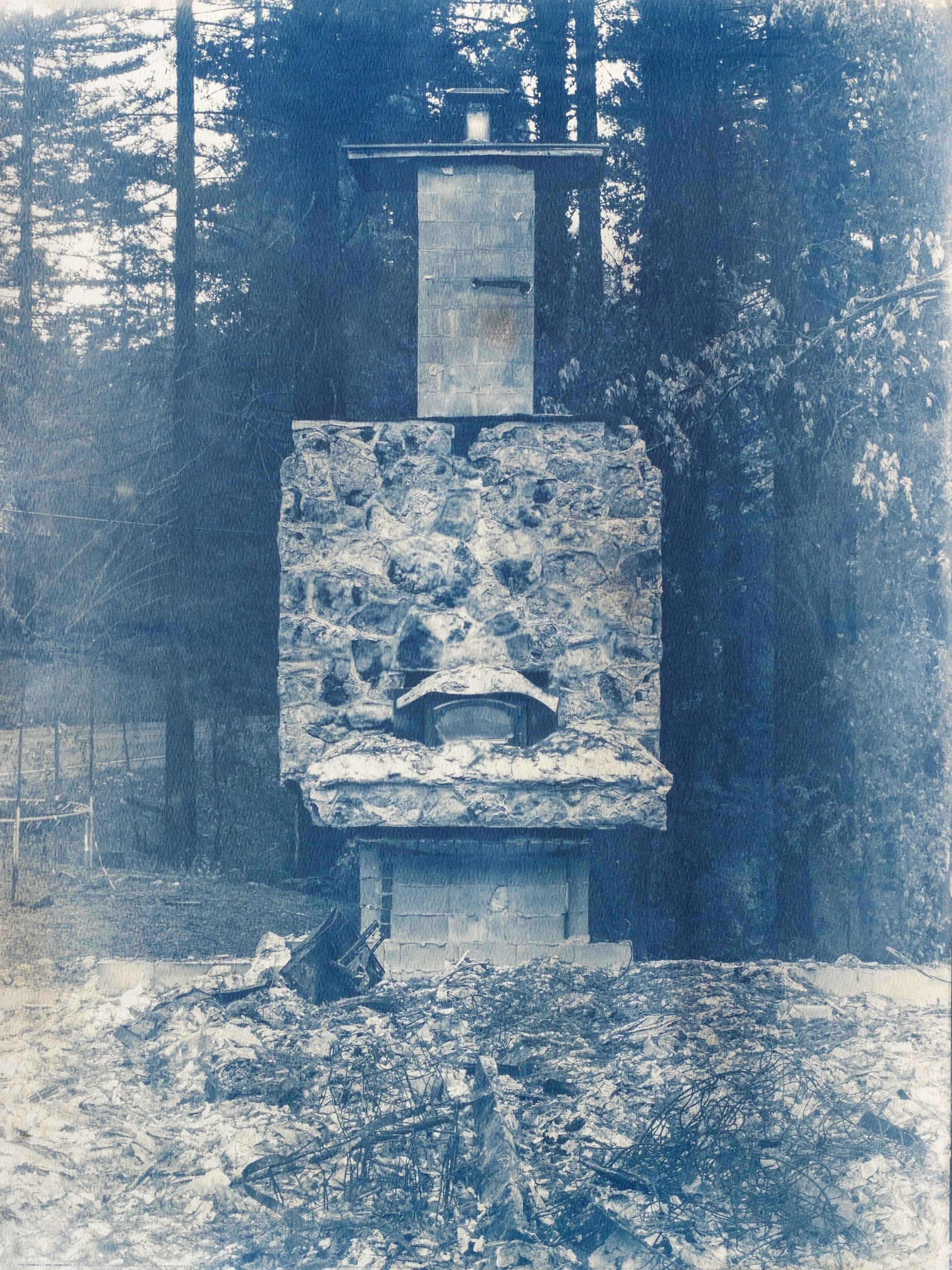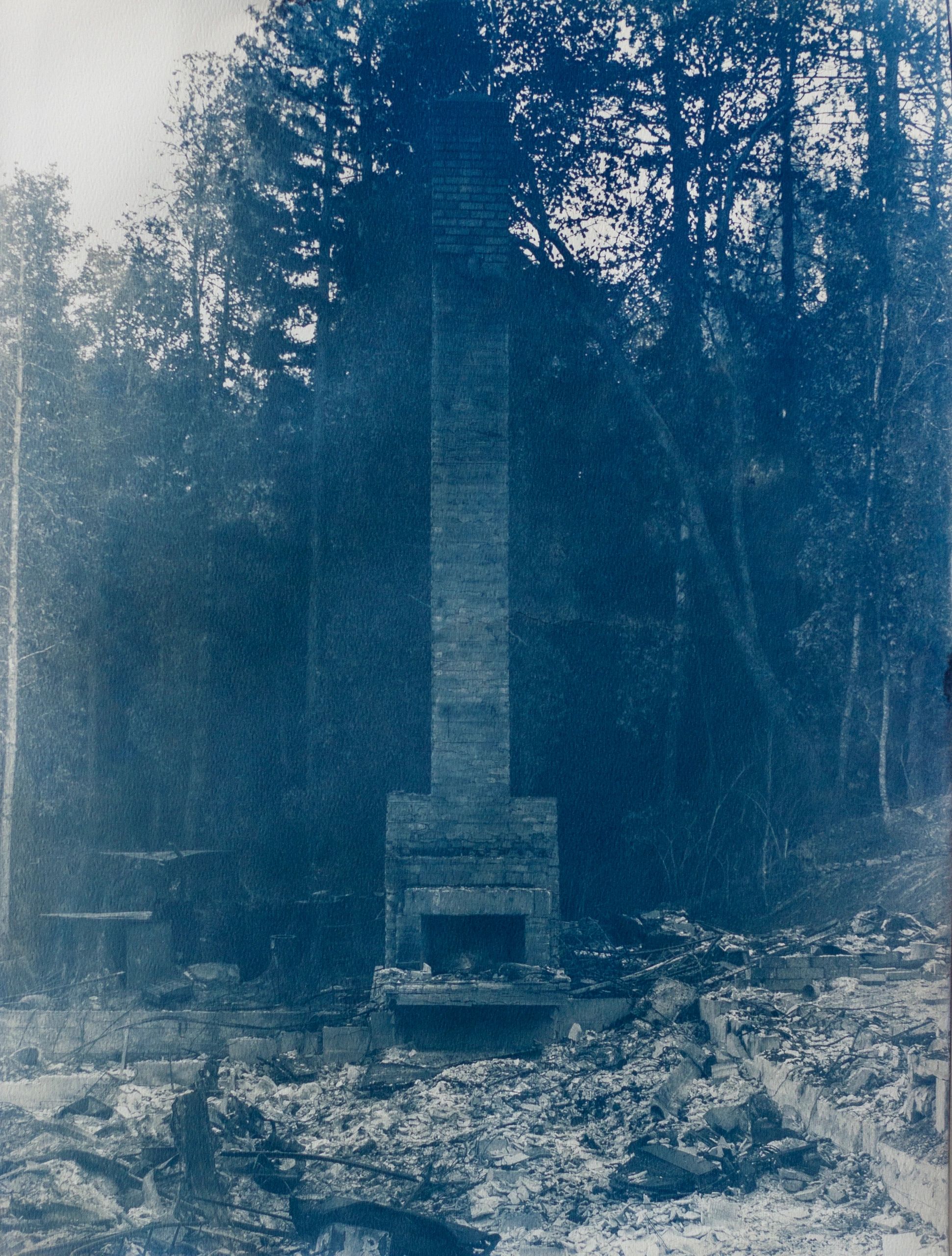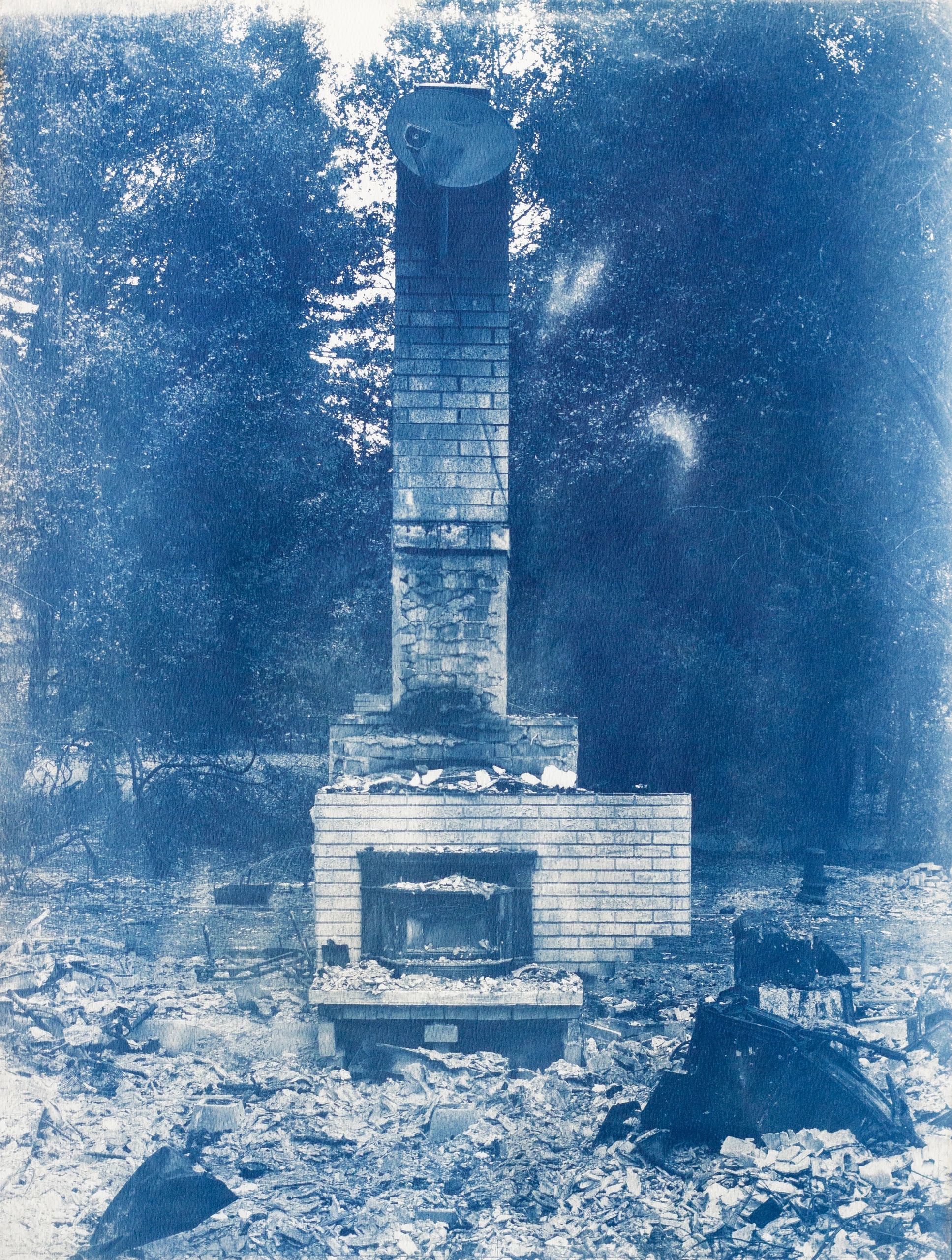 In collaboration with the sun, I make cyanotypes of the chimneys that remain standing after the wildfire devastation in my community. The cyanotypes are made by coating a light sensitive iron solution on watercolor paper and allowing it to dry. I print a digital negative of the chimney on transparency film and expose it on the coated paper to UV light. The print is fixed by washing the exposed paper in water. The image of the chimney slowly emerges with the color blue. I perform this process as a reflection upon the poetics of the sun as the source of fire and water as the remedy. The resulting images are a meditation upon loss and our collective grief, offering a space for healing and renewal.