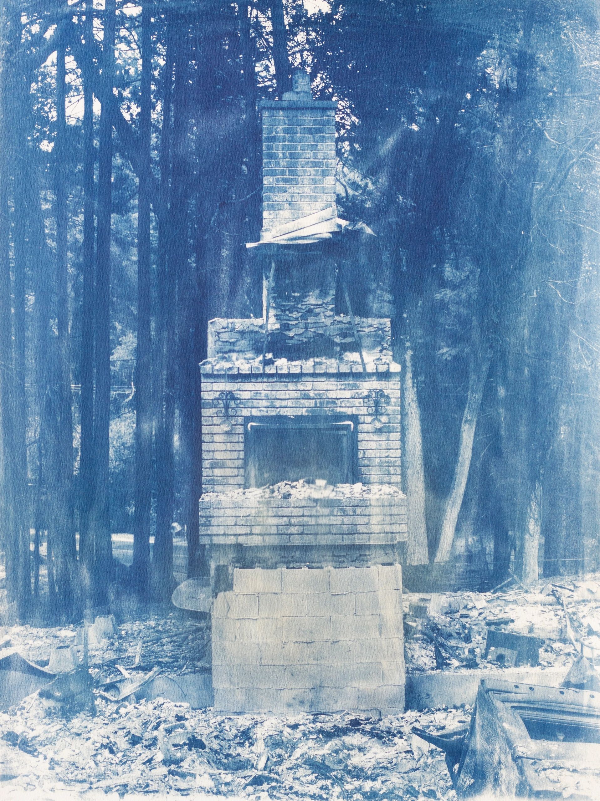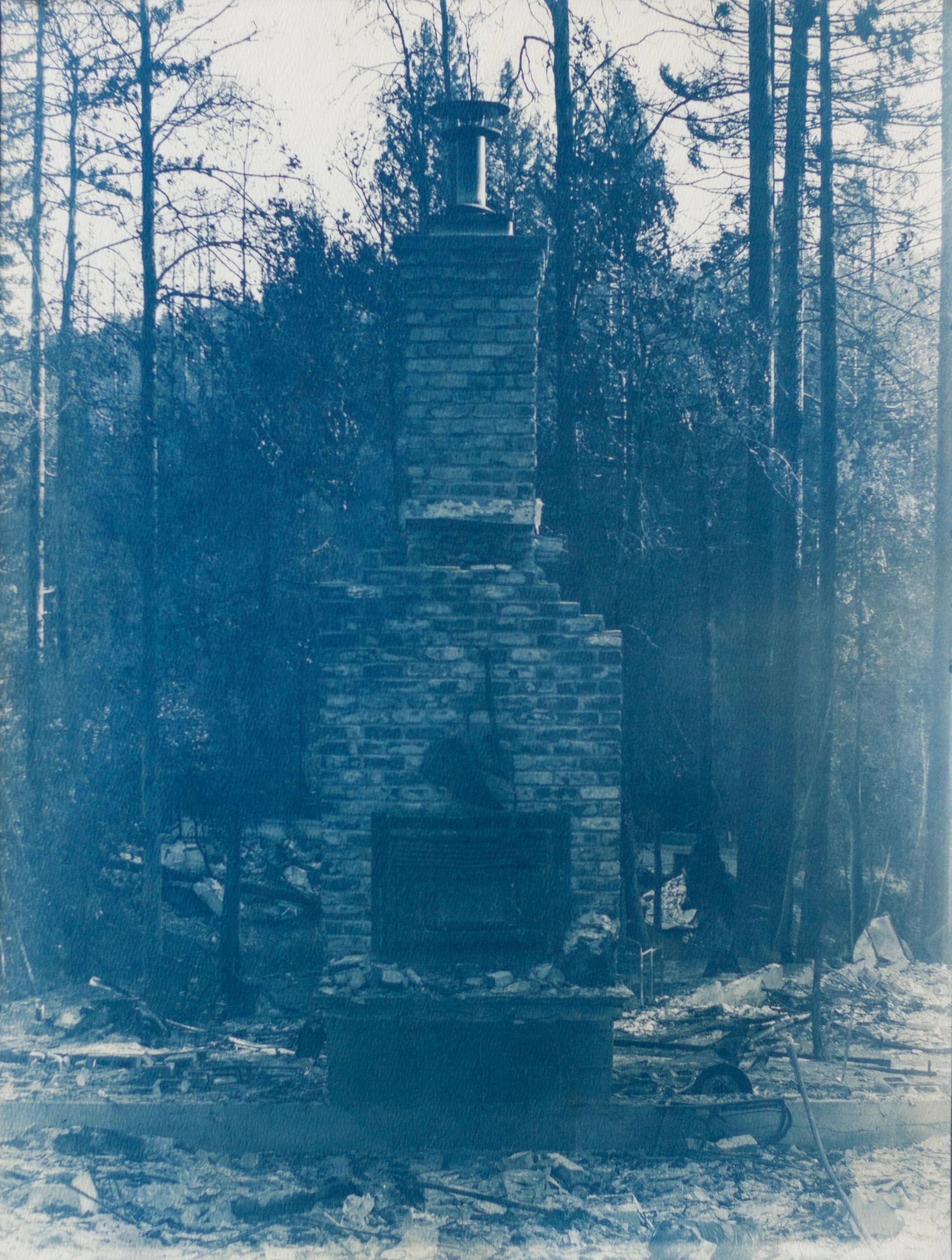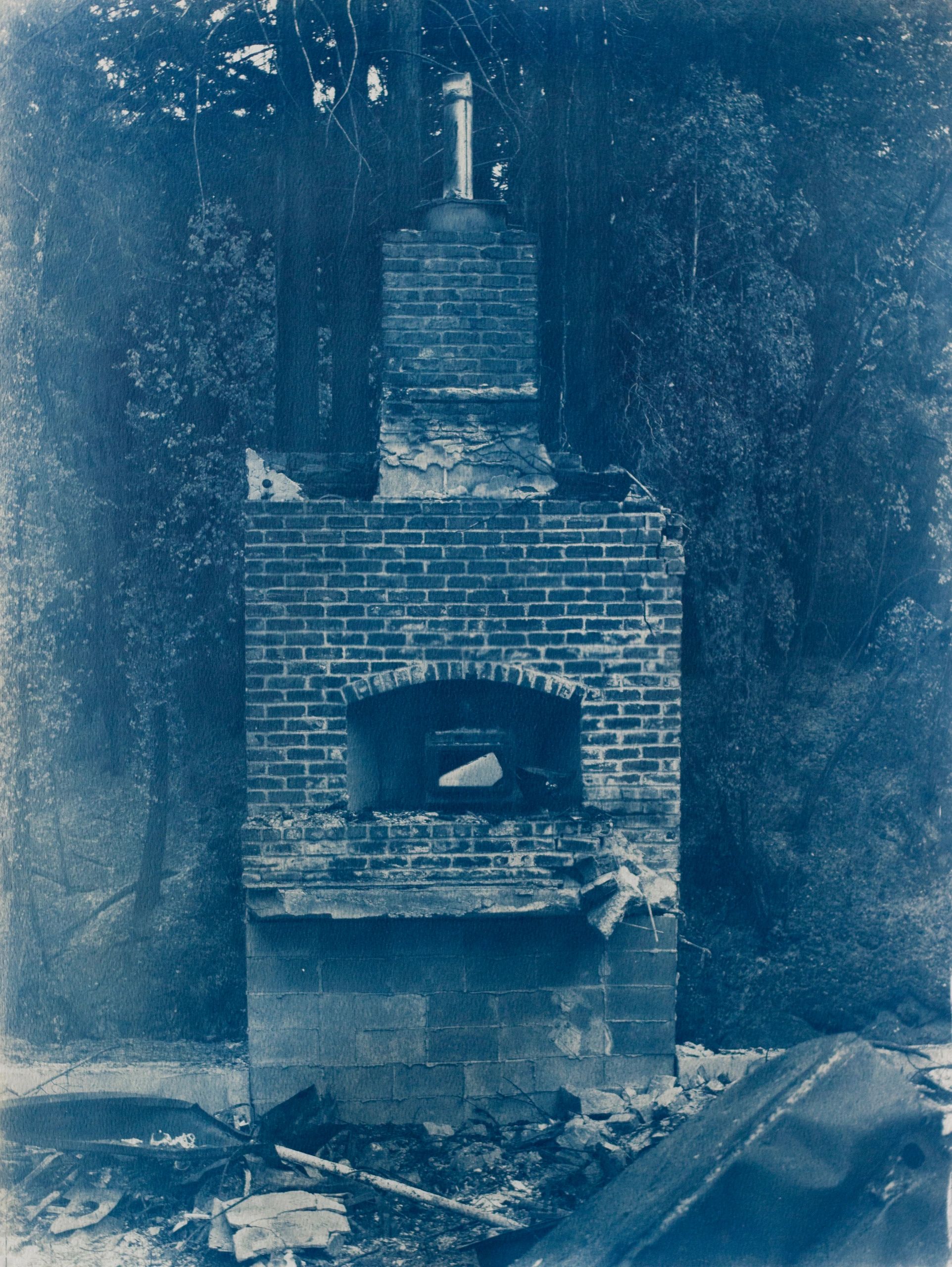 In collaboration with the sun, I make cyanotypes of the chimneys that remain standing after the wildfire devastation in my community. The cyanotypes are made by coating a light sensitive iron solution on watercolor paper and allowing it to dry. I print a digital negative of the chimney on transparency film and expose it on the coated paper to UV light. The print is fixed by washing the exposed paper in water. The image of the chimney slowly emerges with the color blue. I perform this process as a reflection upon the poetics of the sun as the source of fire and water as the remedy. The resulting images are a meditation upon loss and our collective grief, offering a space for healing and renewal.
